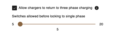 I tillegg til 3-til-1-fase brytestrøm, har du muligheten til å la ladestasjonen bytte mellom en- og trefaselading. Glidebryteren kan brukes til å sette antall tillatte bytter før låsing til en enkelt fase.